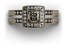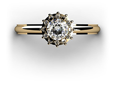 Pierścionek z kamieniem centralnym oraz kamieniami wokół niego bez kamieni na obrączce